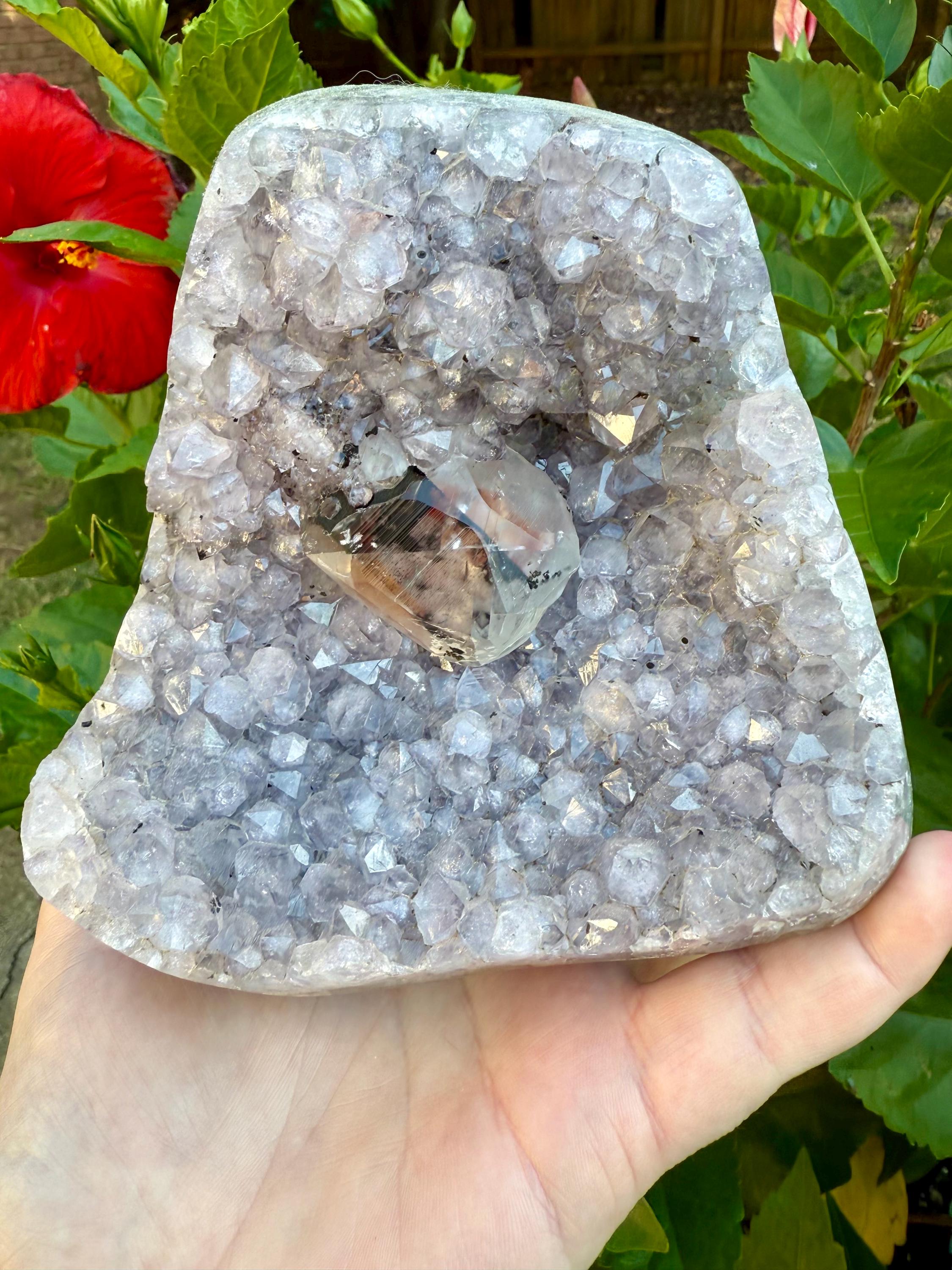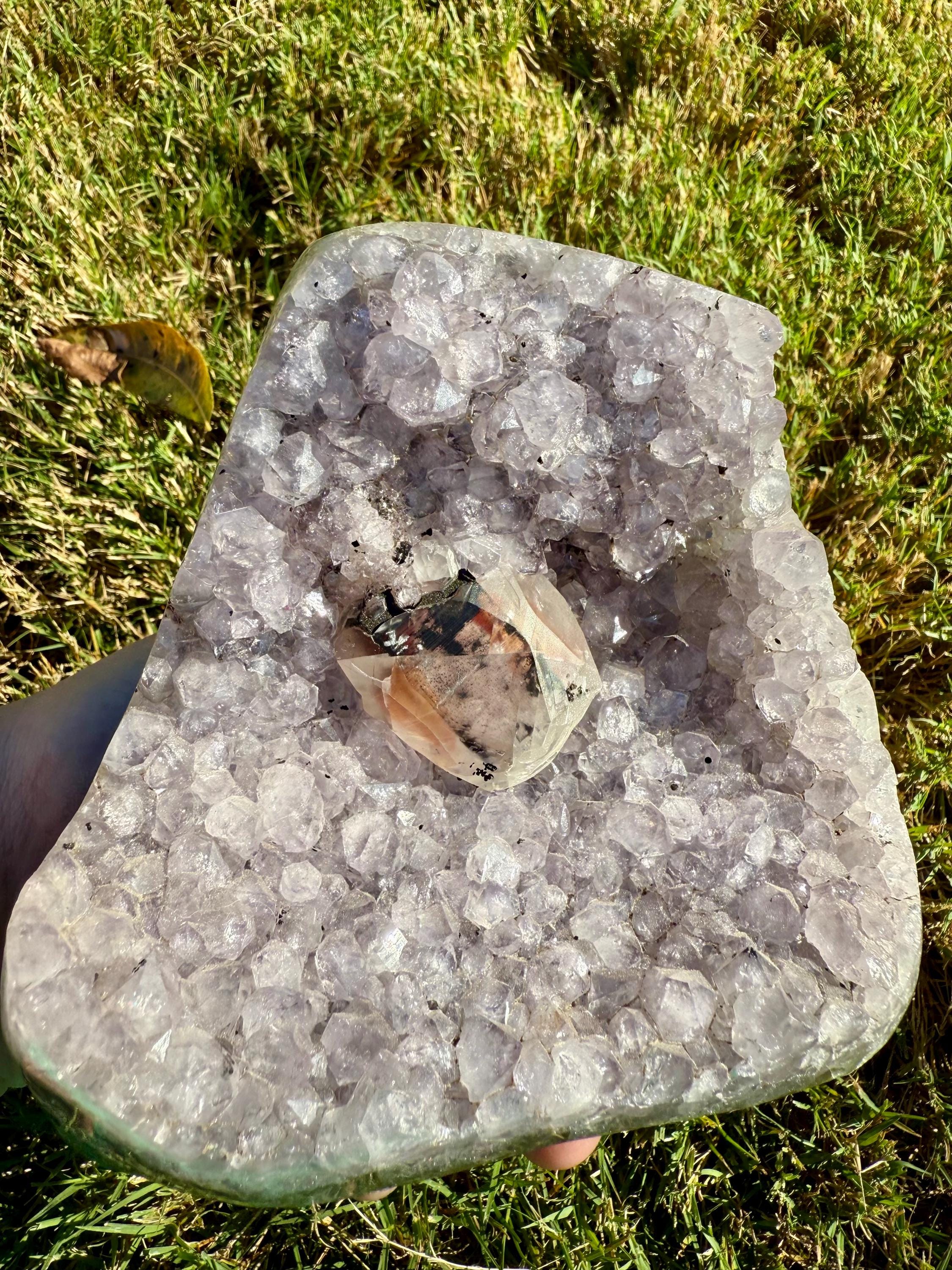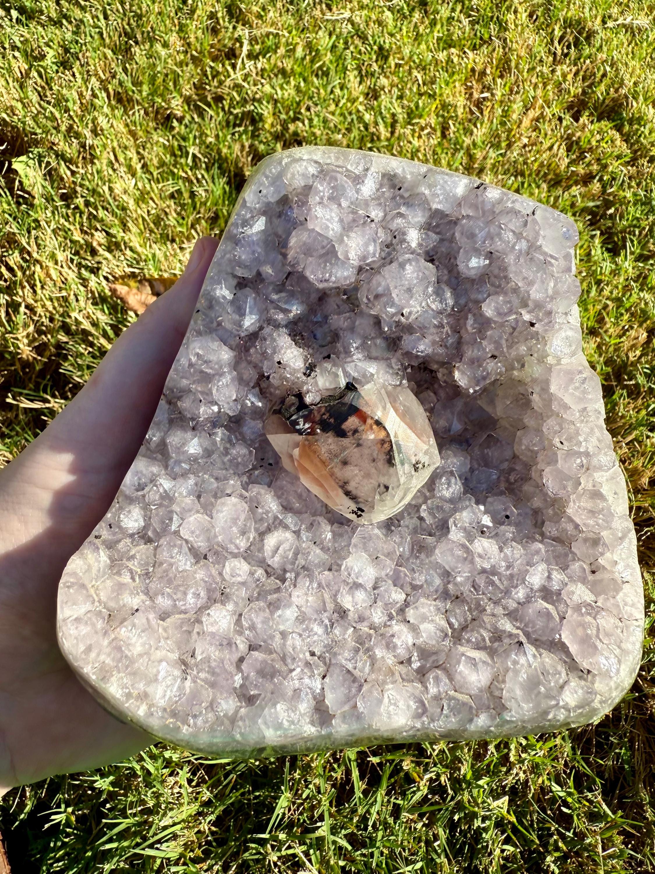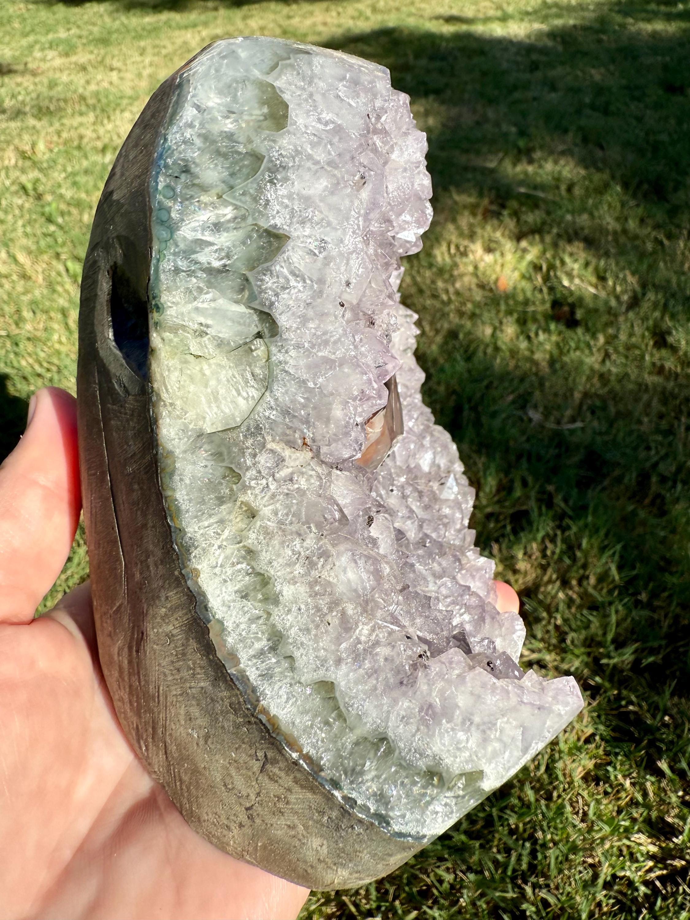 Bring the beauty and high vibration of Uruguay's world famous amethyst mines into your home. This stunning natural geode features purple amethyst points surrounding a rare calcite crystal inclusion- a formation that symbolizes balance, clarity, and transformation. Each piece is one-of-a-kind, making it a powerful and elegant addition to any crystal collection or sacred space.