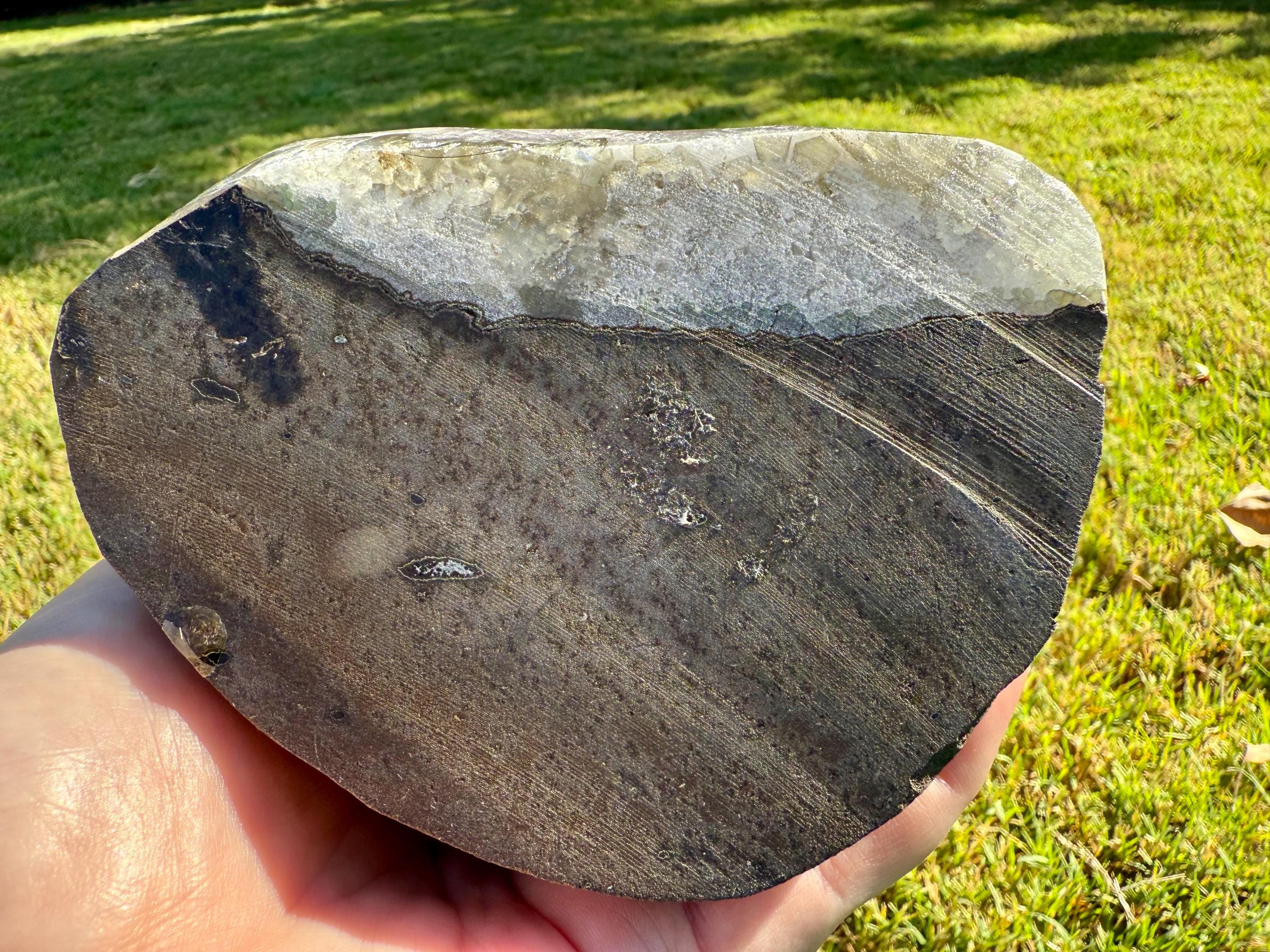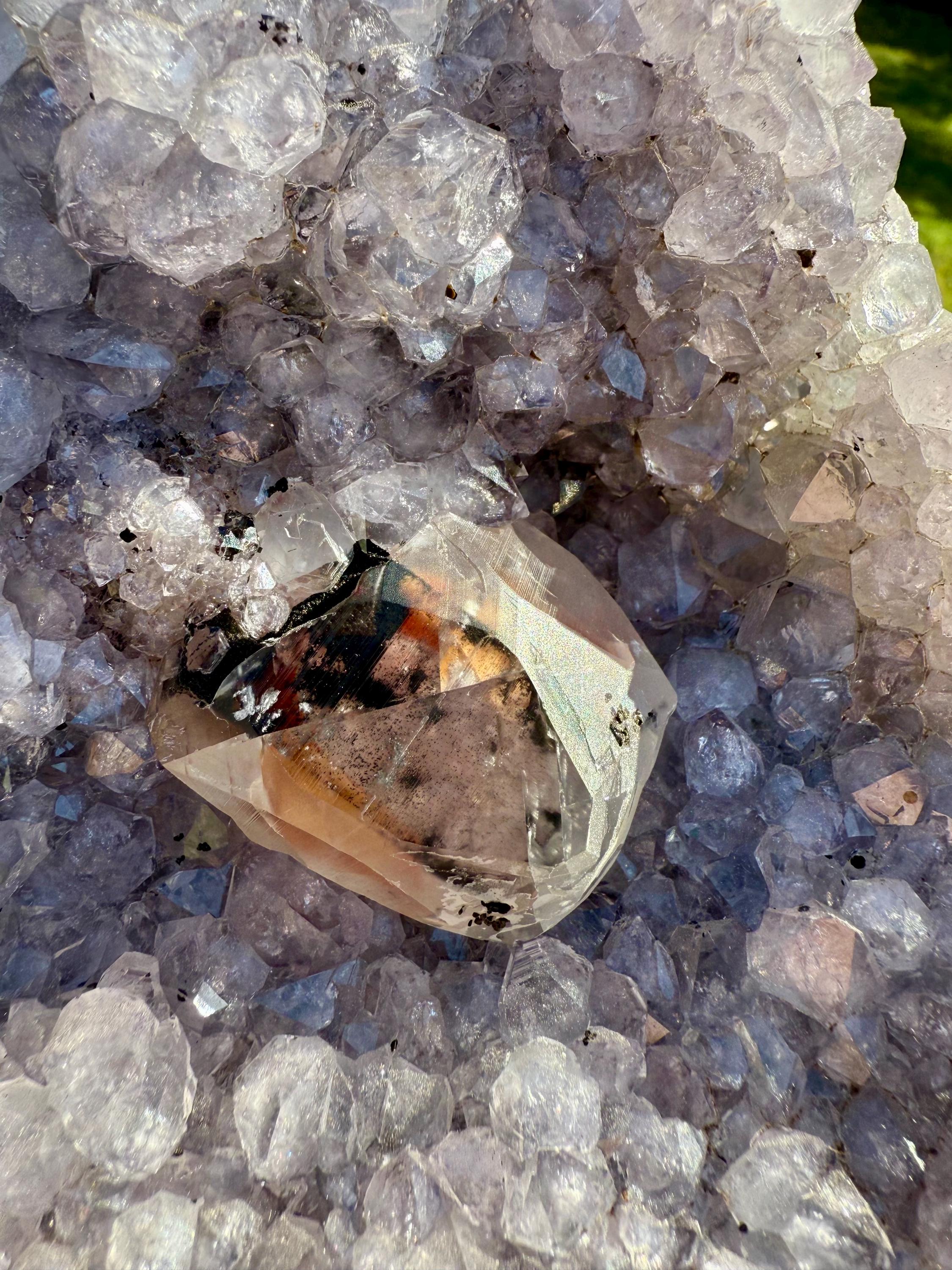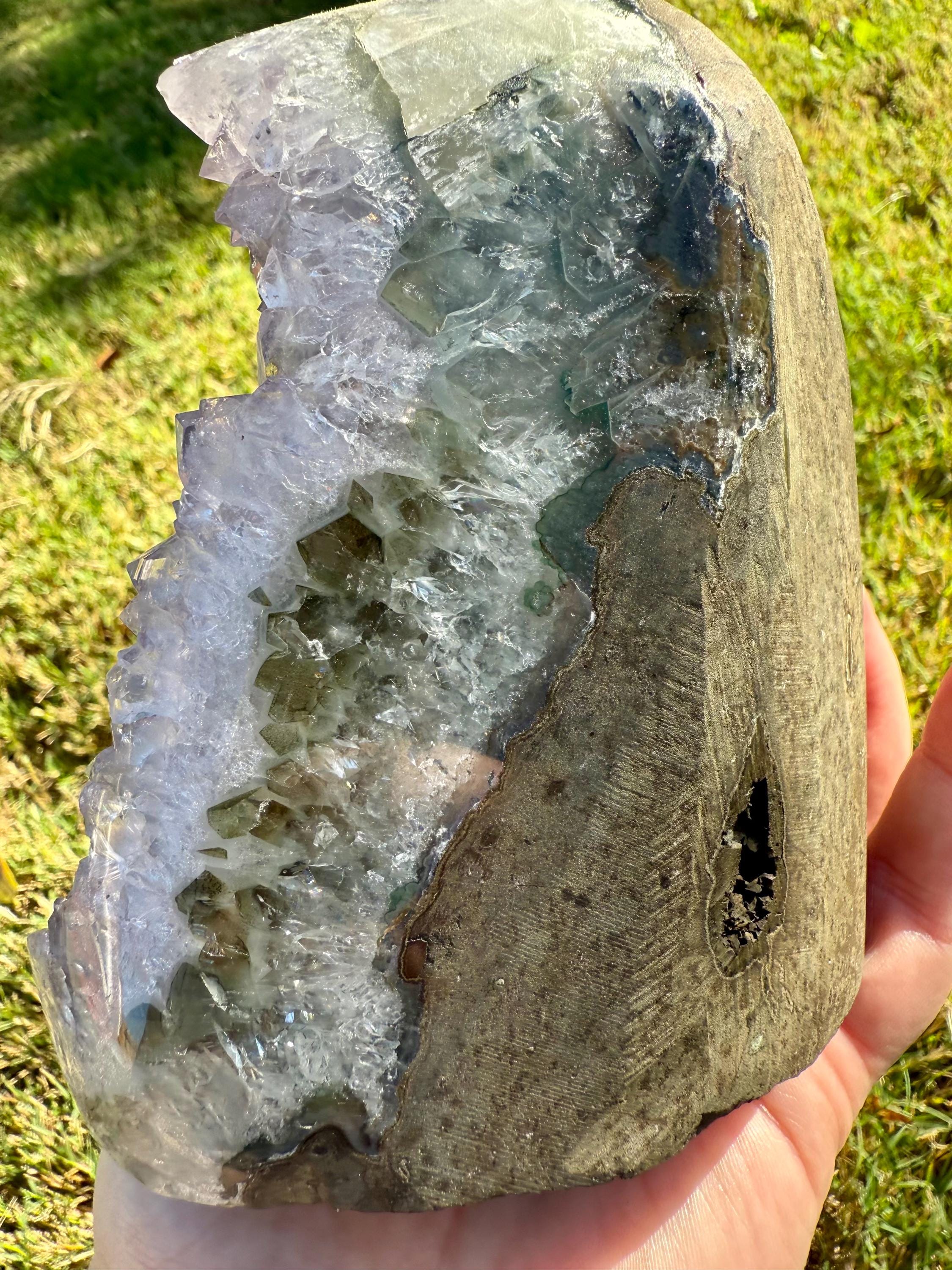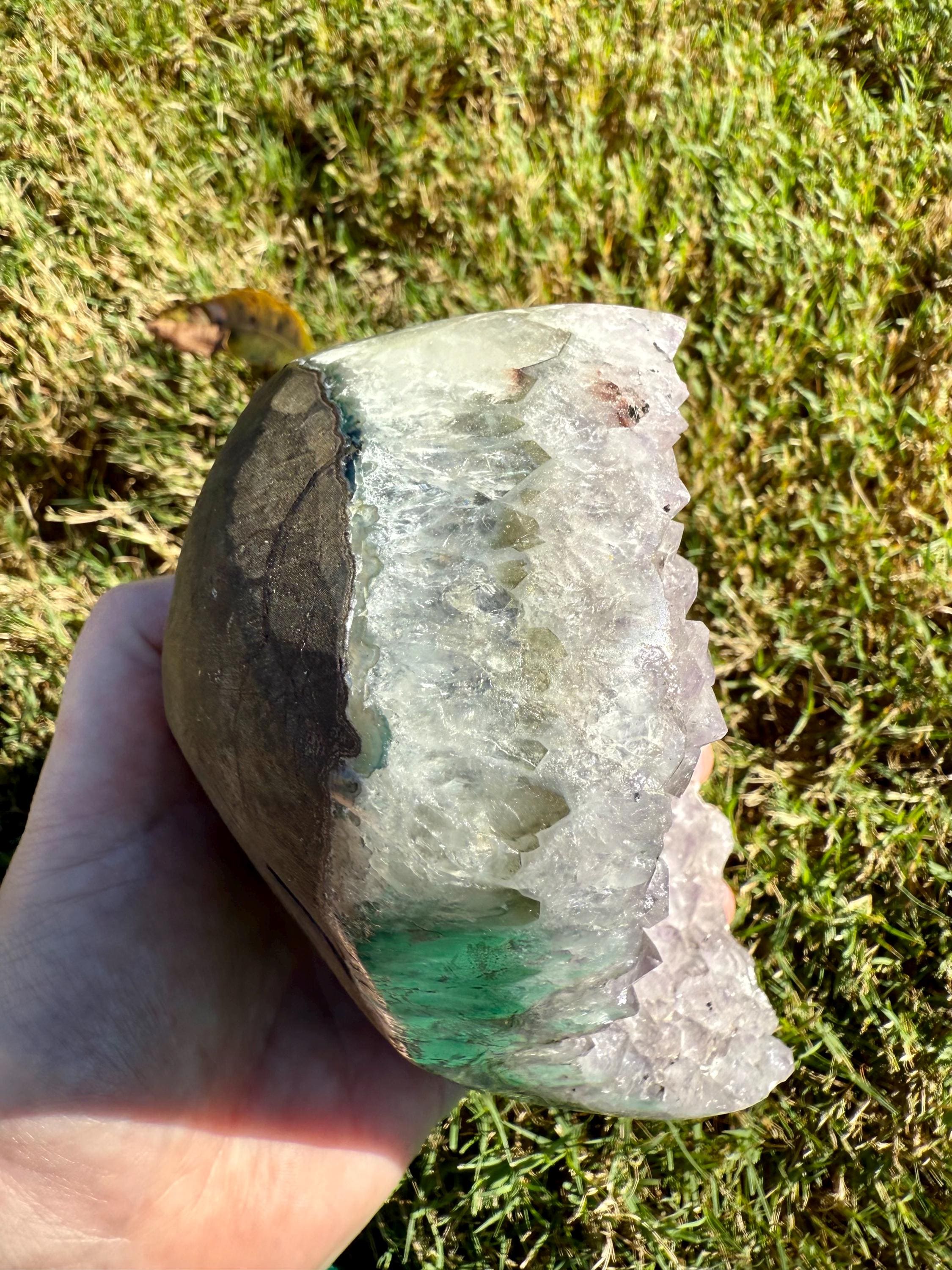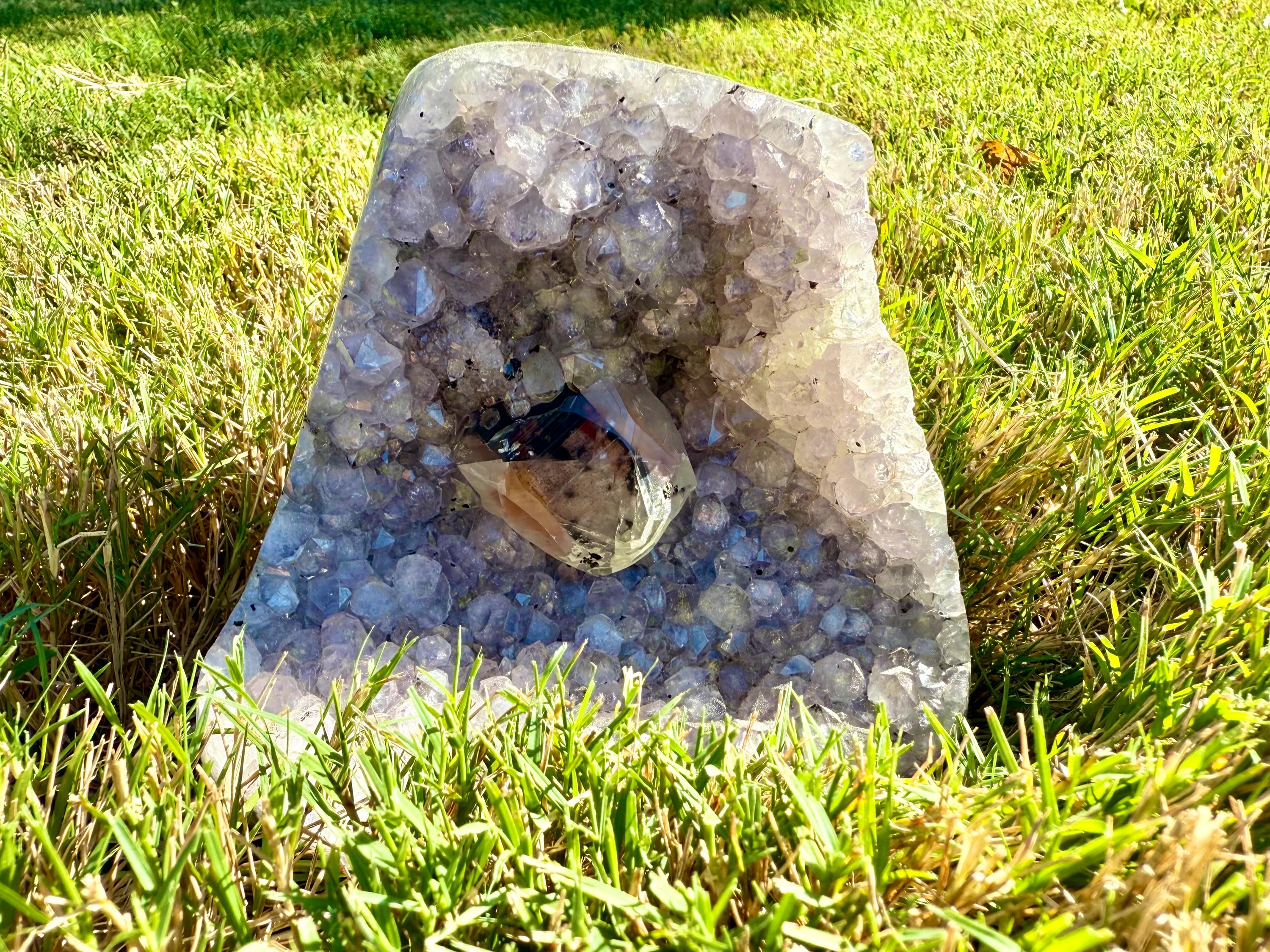 Bring the beauty and high vibration of Uruguay's world famous amethyst mines into your home. This stunning natural geode features purple amethyst points surrounding a rare calcite crystal inclusion- a formation that symbolizes balance, clarity, and transformation. Each piece is one-of-a-kind, making it a powerful and elegant addition to any crystal collection or sacred space.