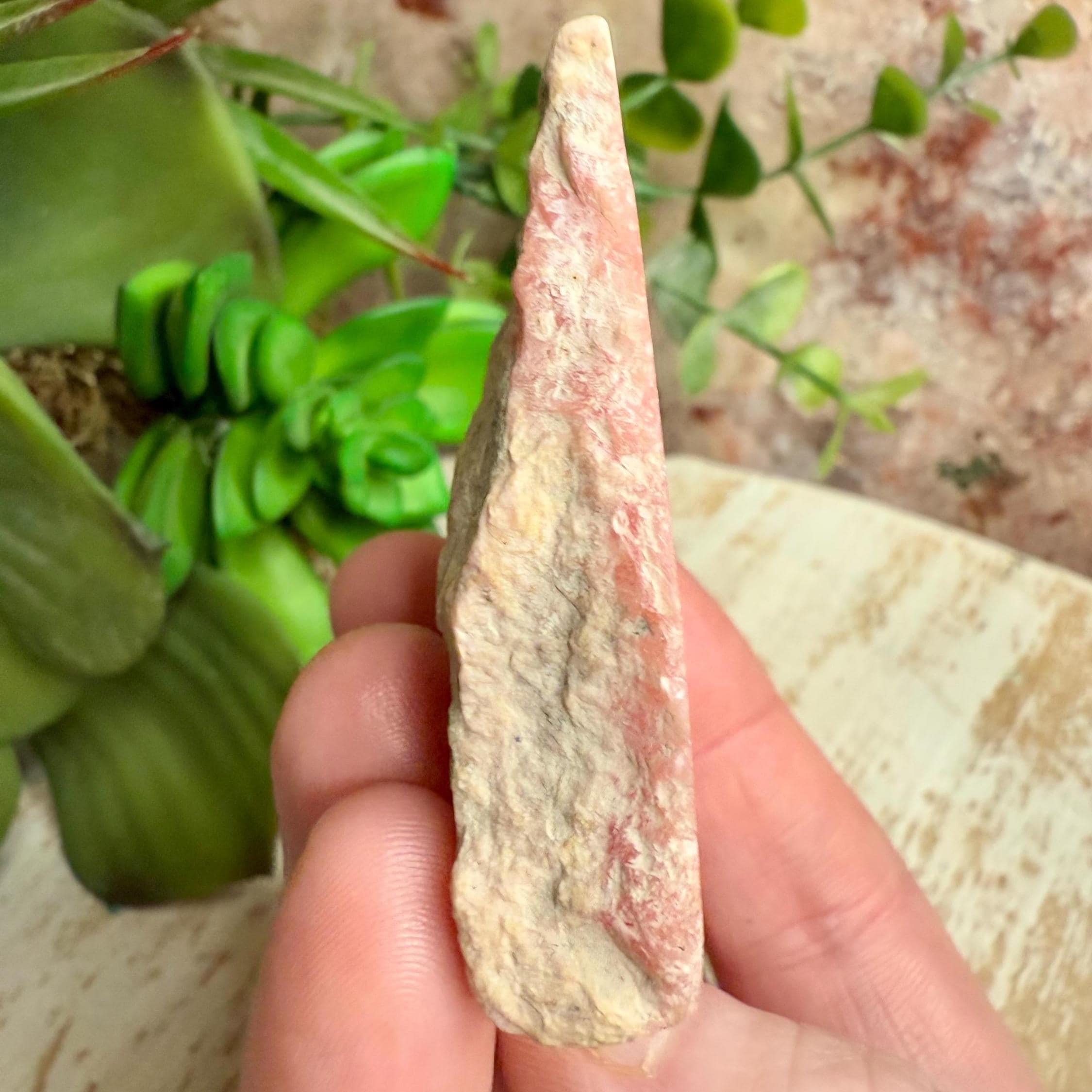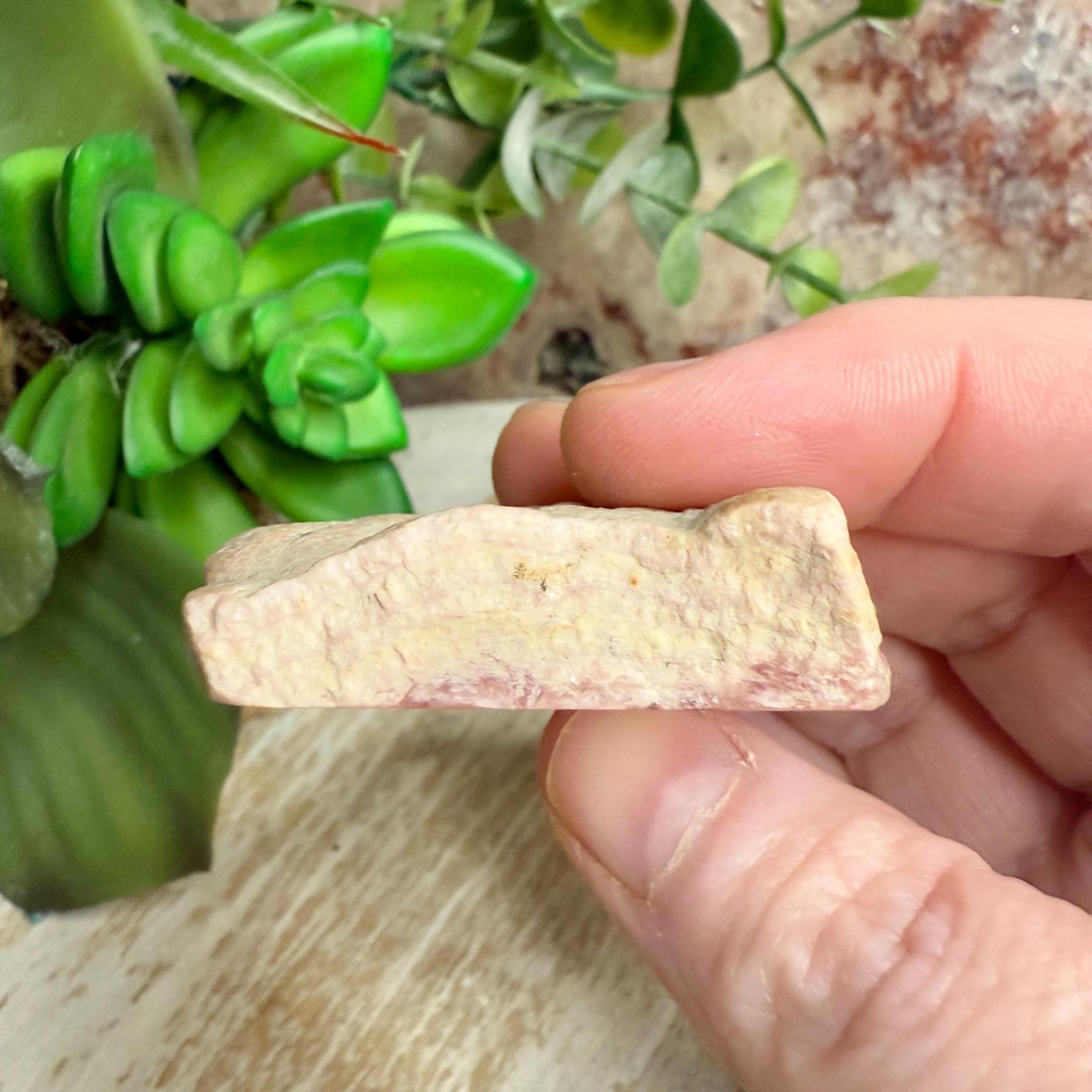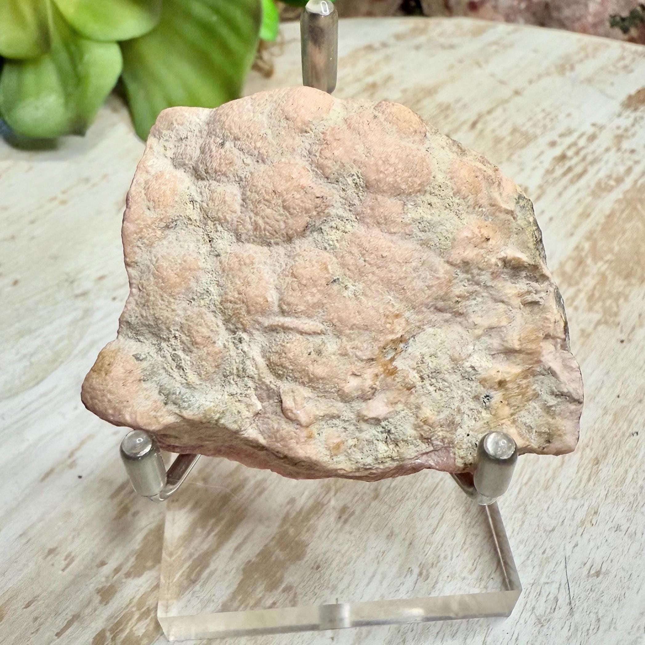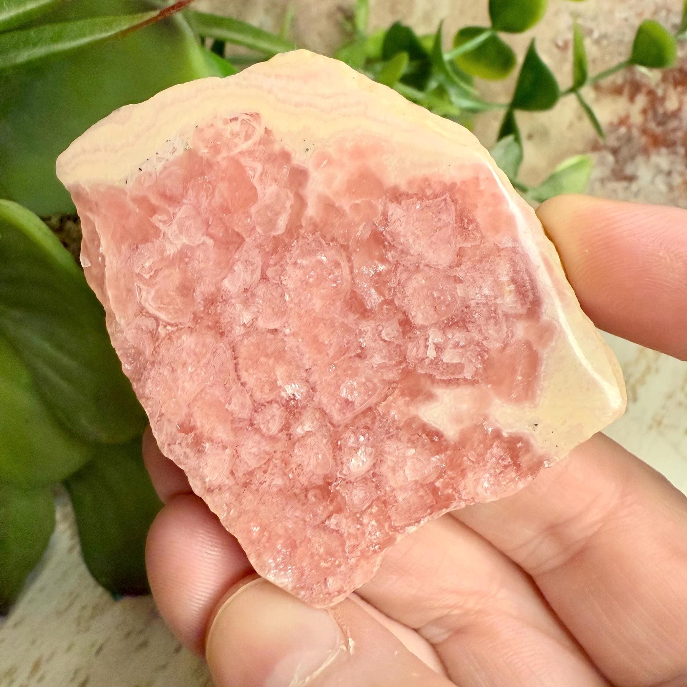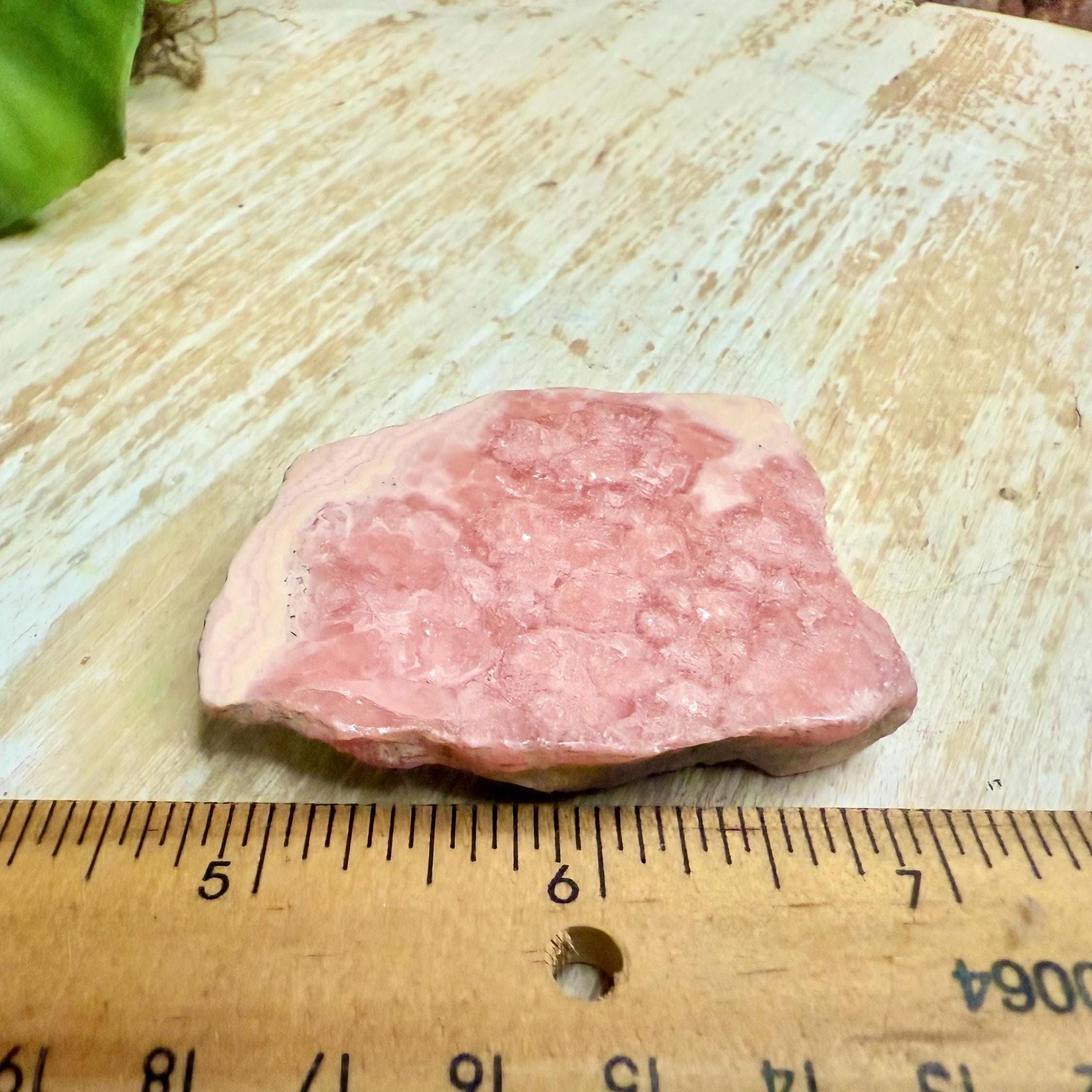 Beautiful natural rhodochrosite slab with vivid pink banding and a smooth polished finish with a natural rough outside. This crystal slice makes a stunning décor piece, healing stone, or gift for any crystal lover. Each pink crystal slab is unique and full of warm, heart-centered energy.