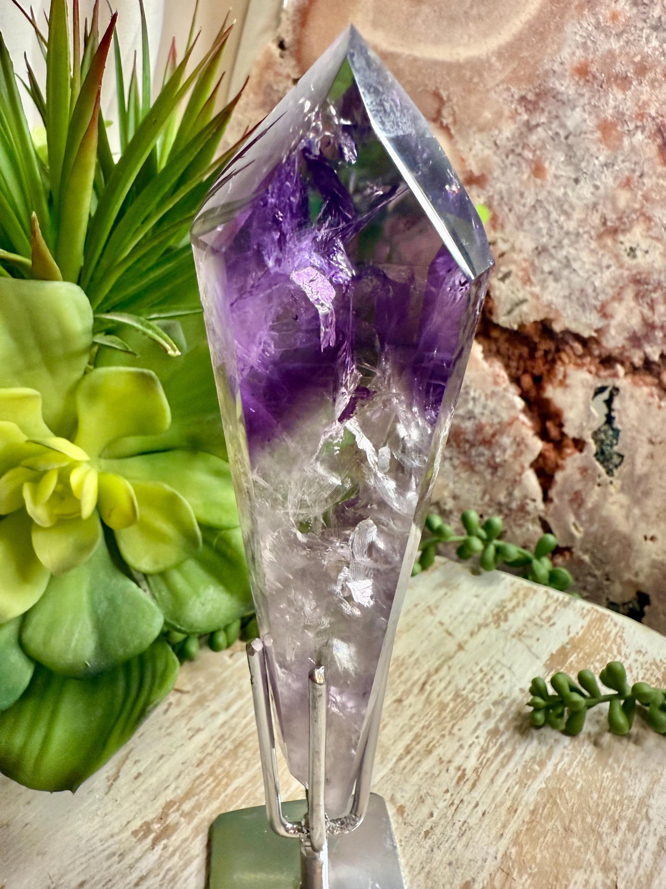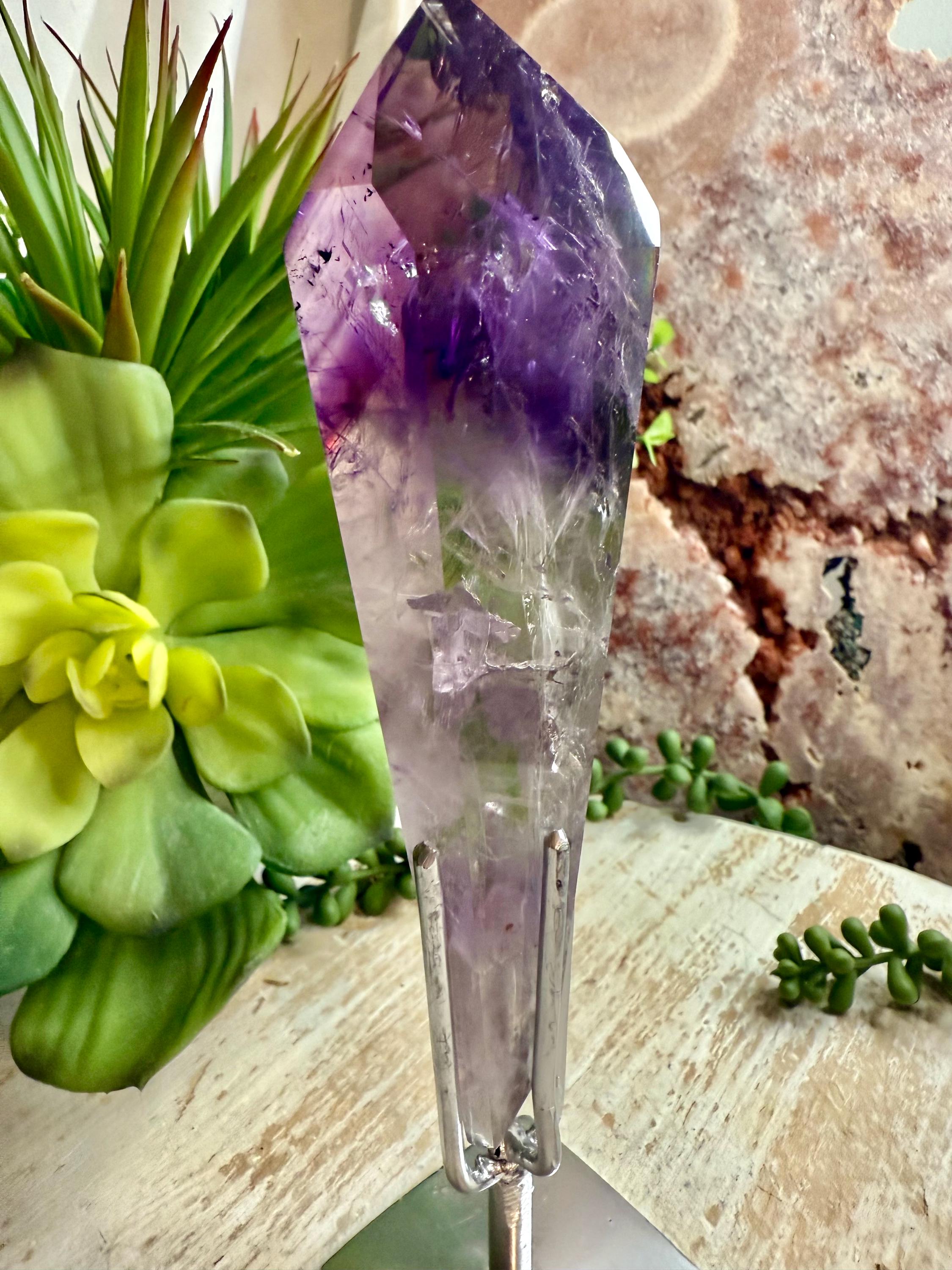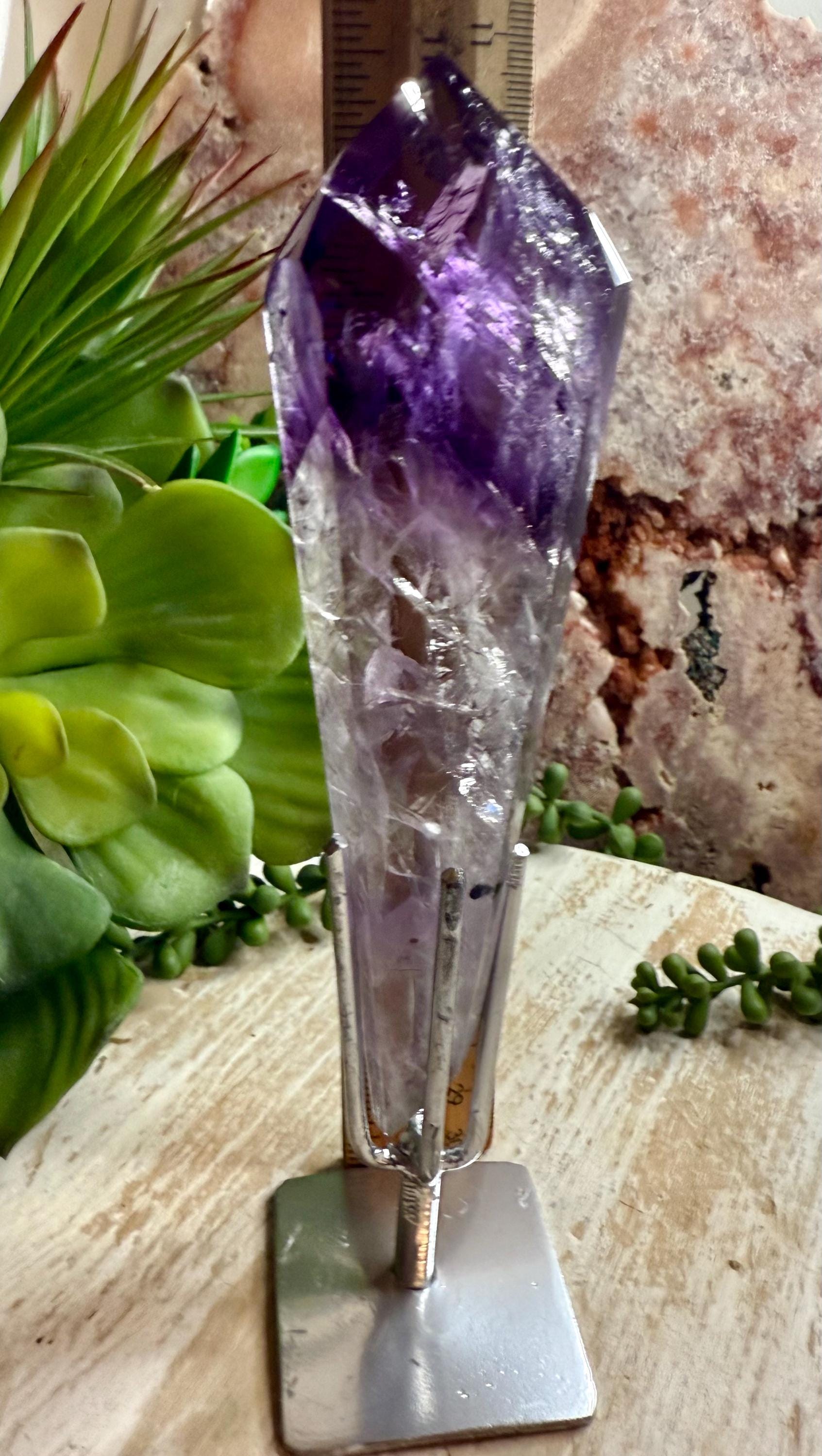 Carefully selected for visual appeal, this piece displays rich purple tones with natural variations that make each angle unique. the custom stand provides stability and an elevated presentation, making it ideal for display, collection, or decor.