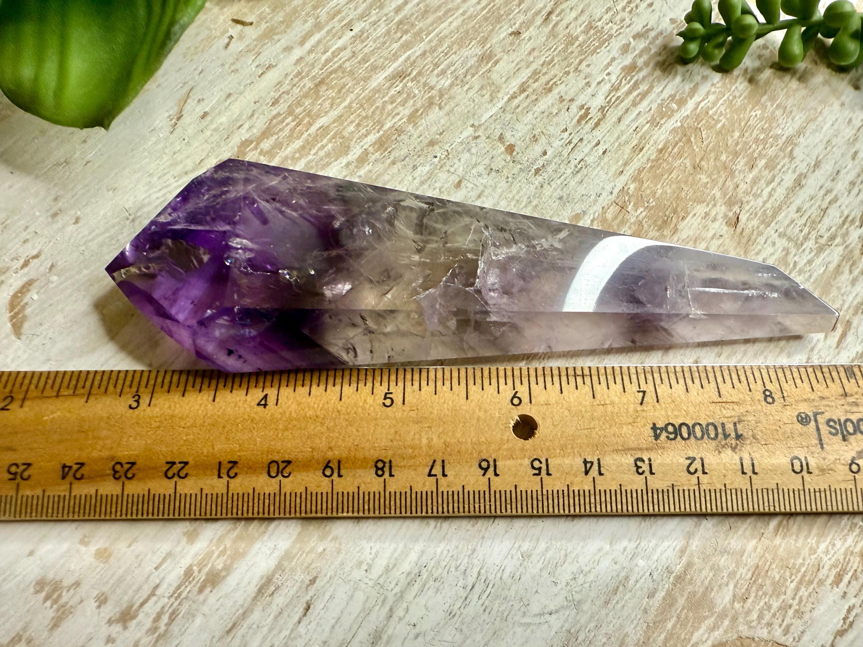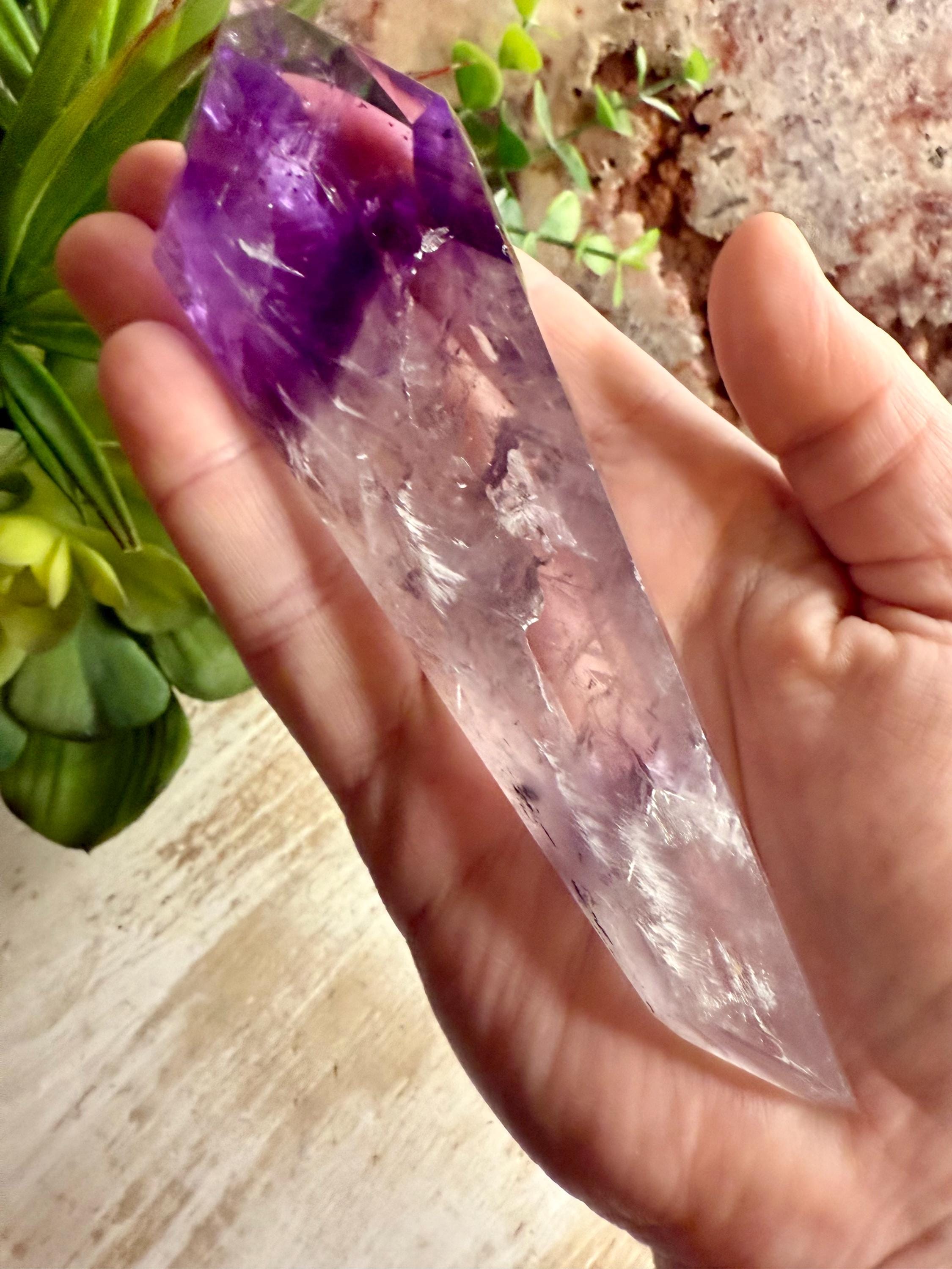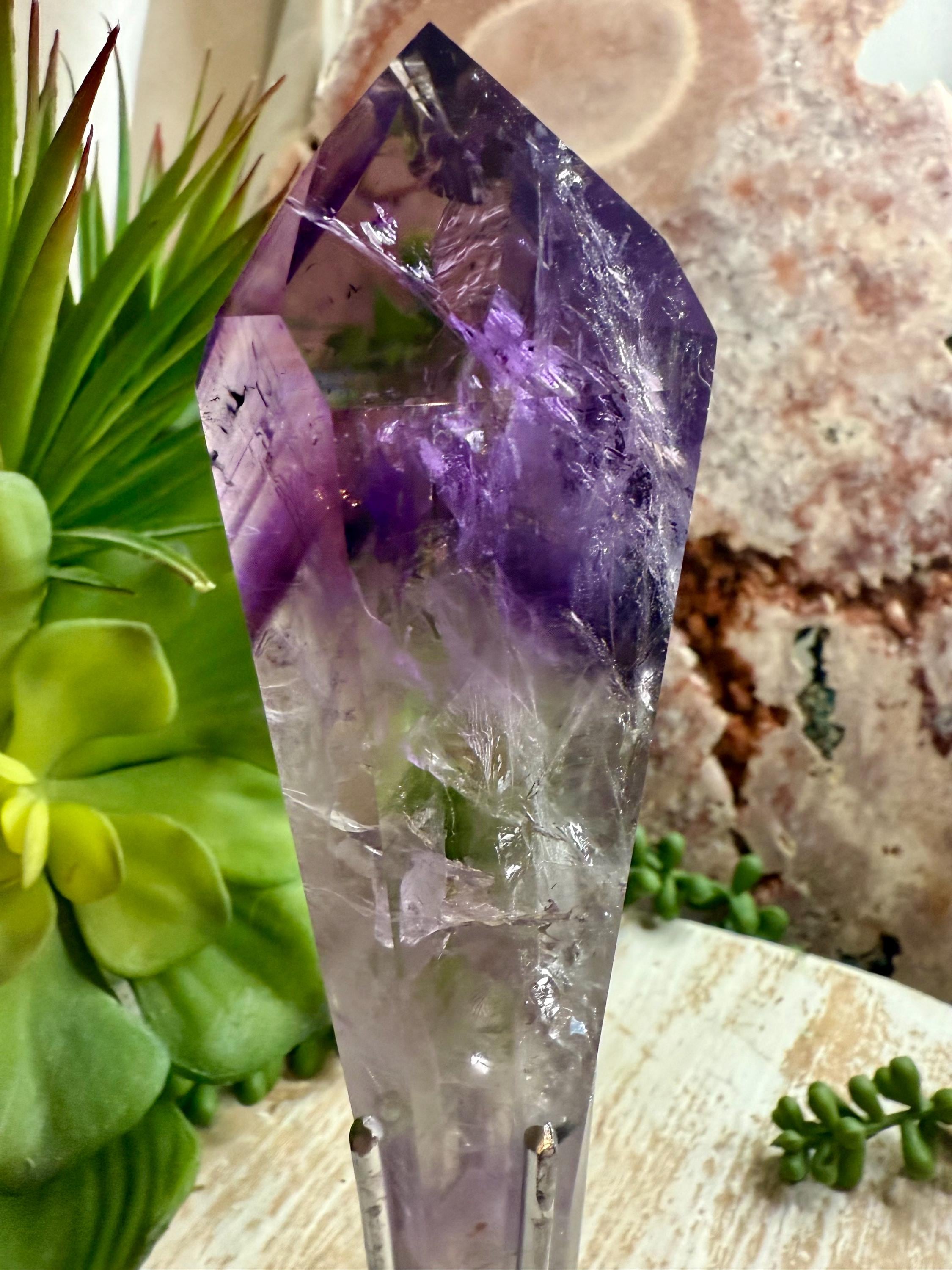 Carefully selected for visual appeal, this piece displays rich purple tones with natural variations that make each angle unique. the custom stand provides stability and an elevated presentation, making it ideal for display, collection, or decor.
