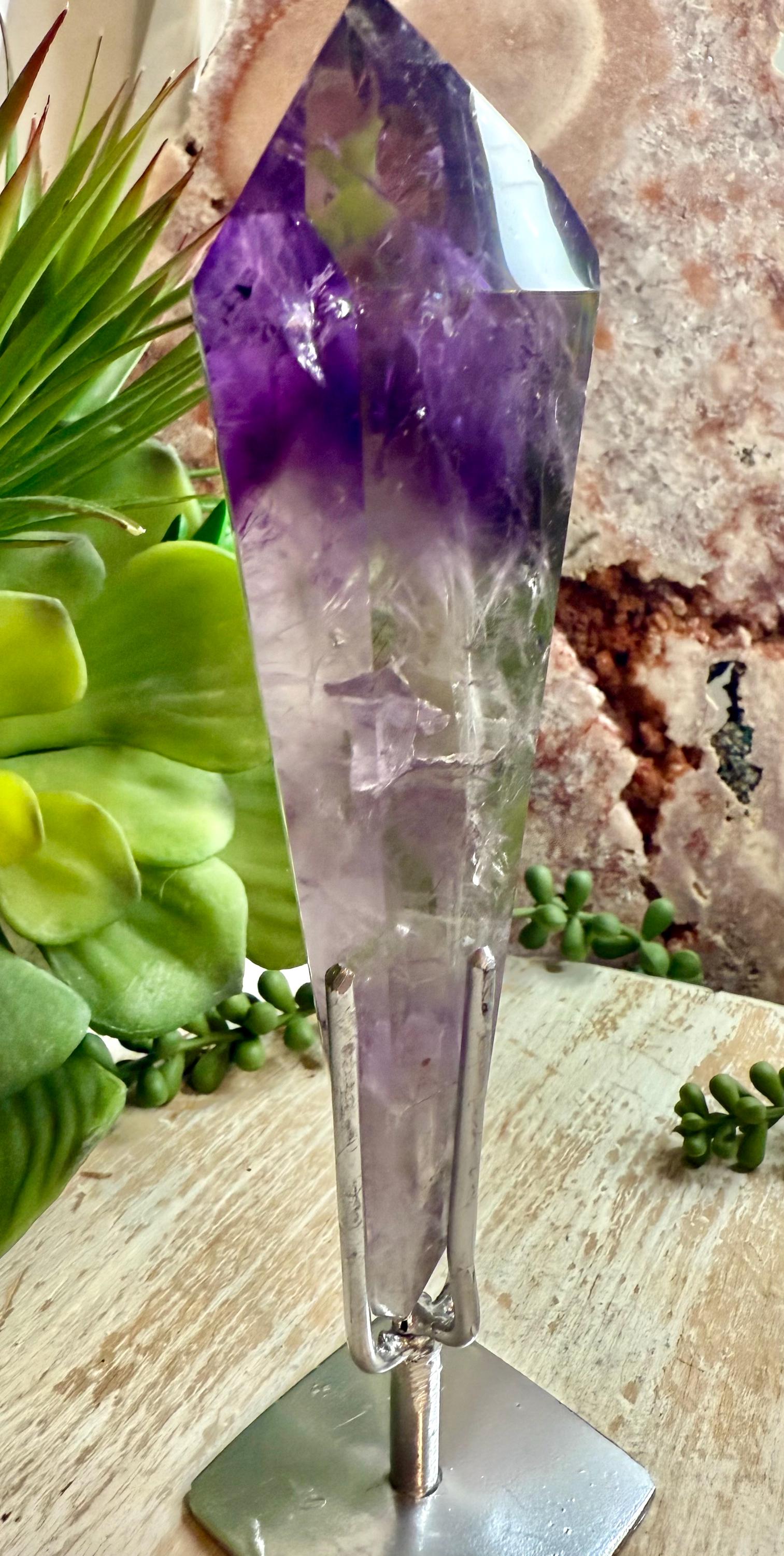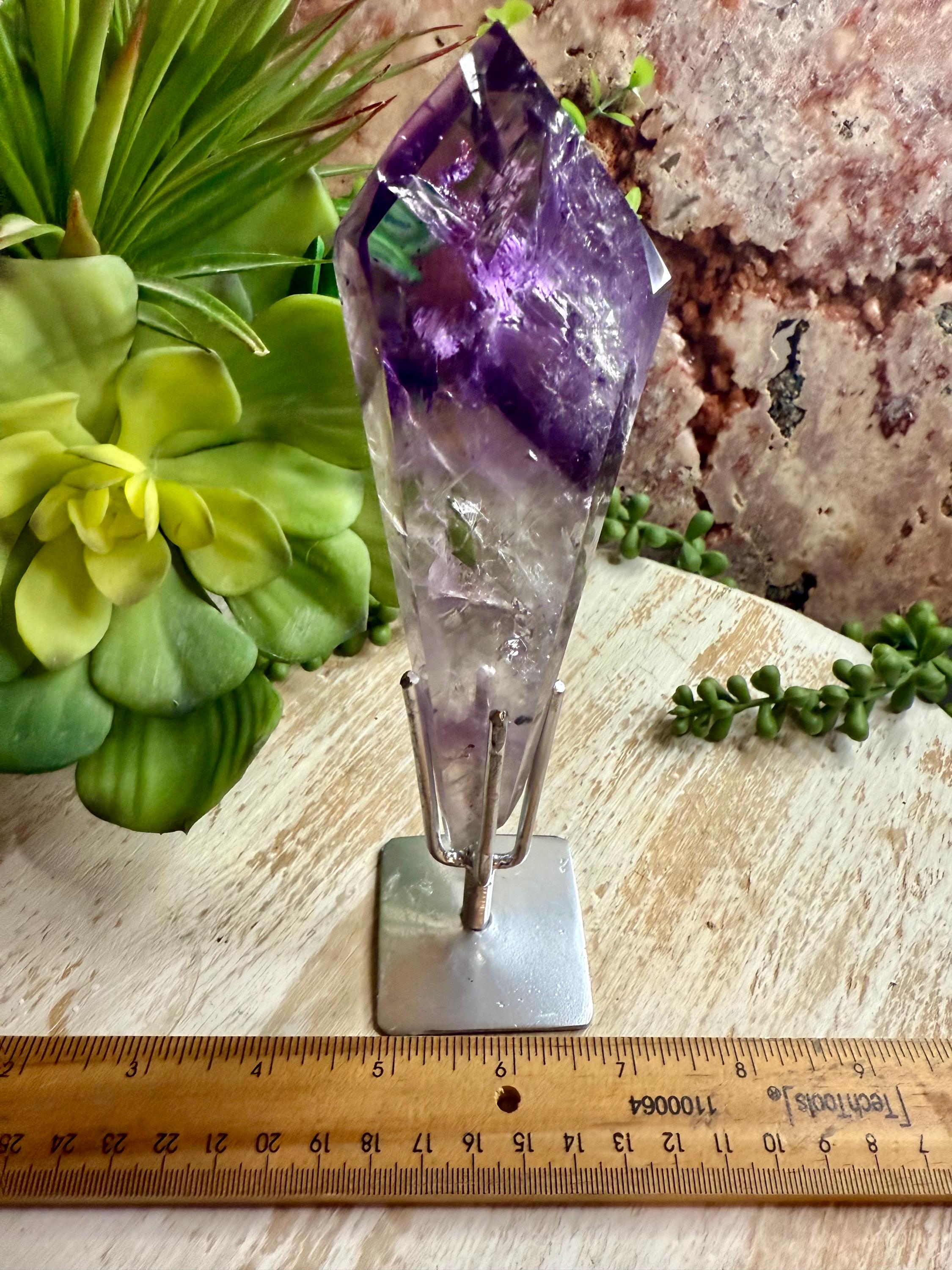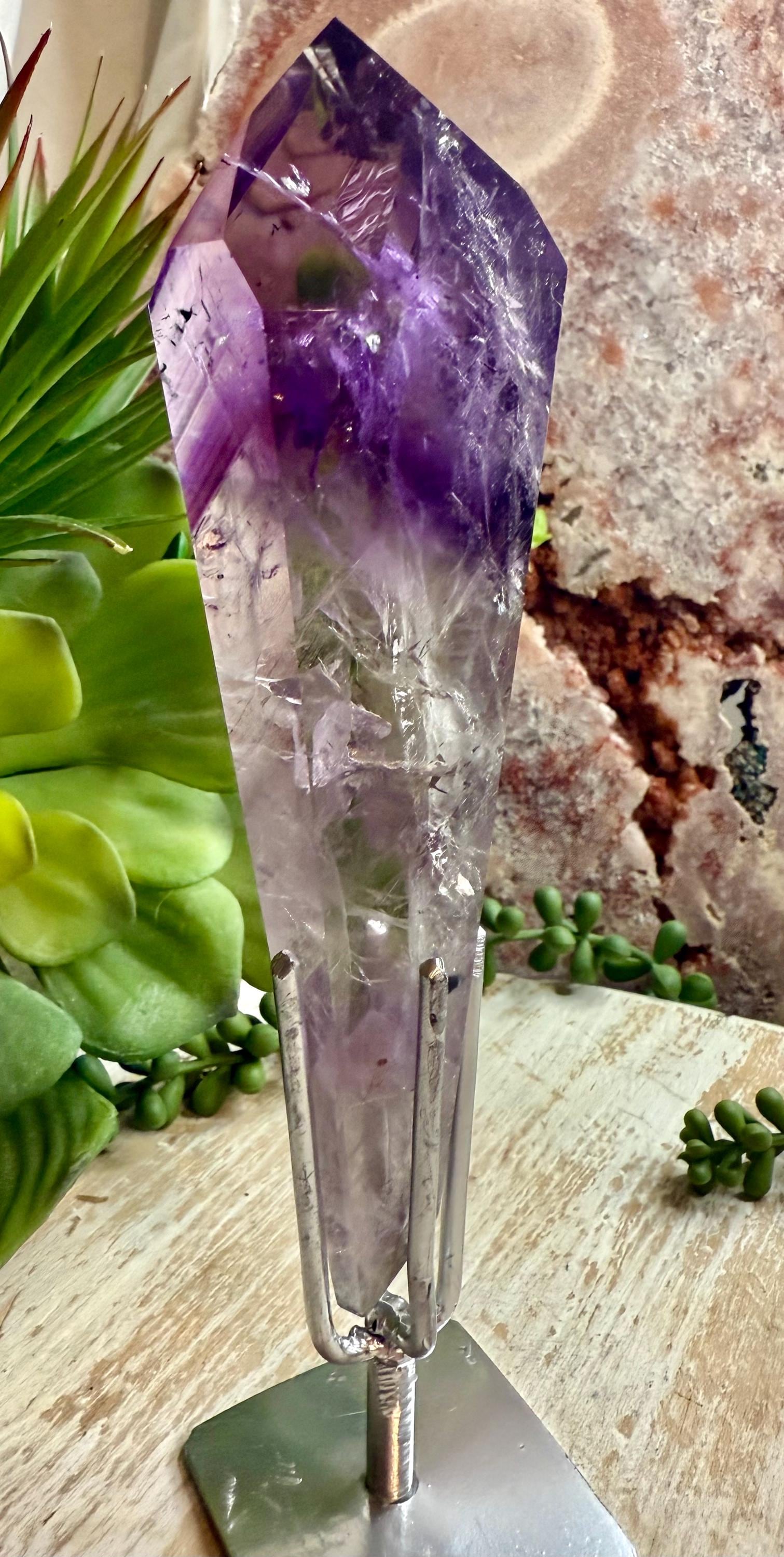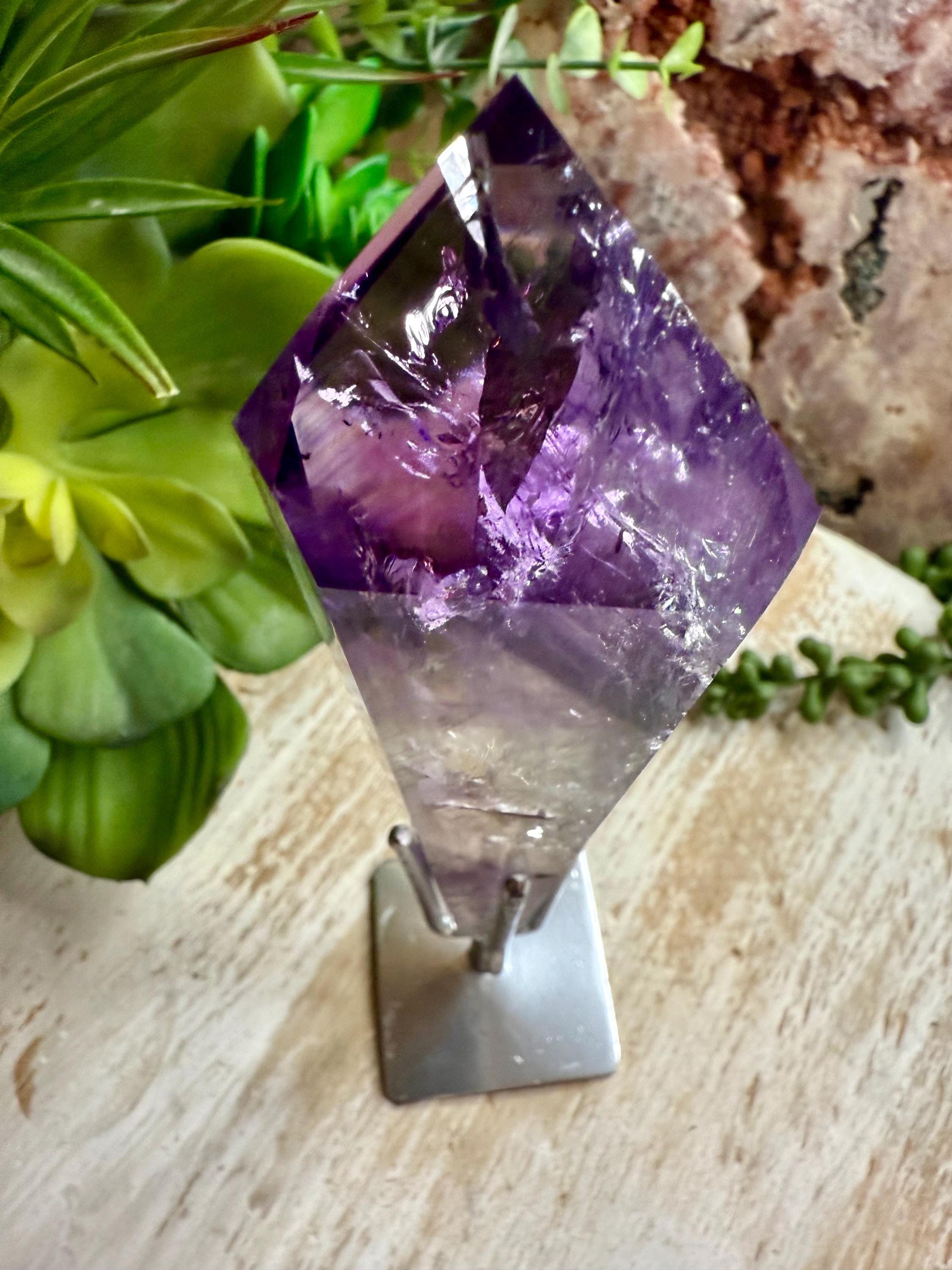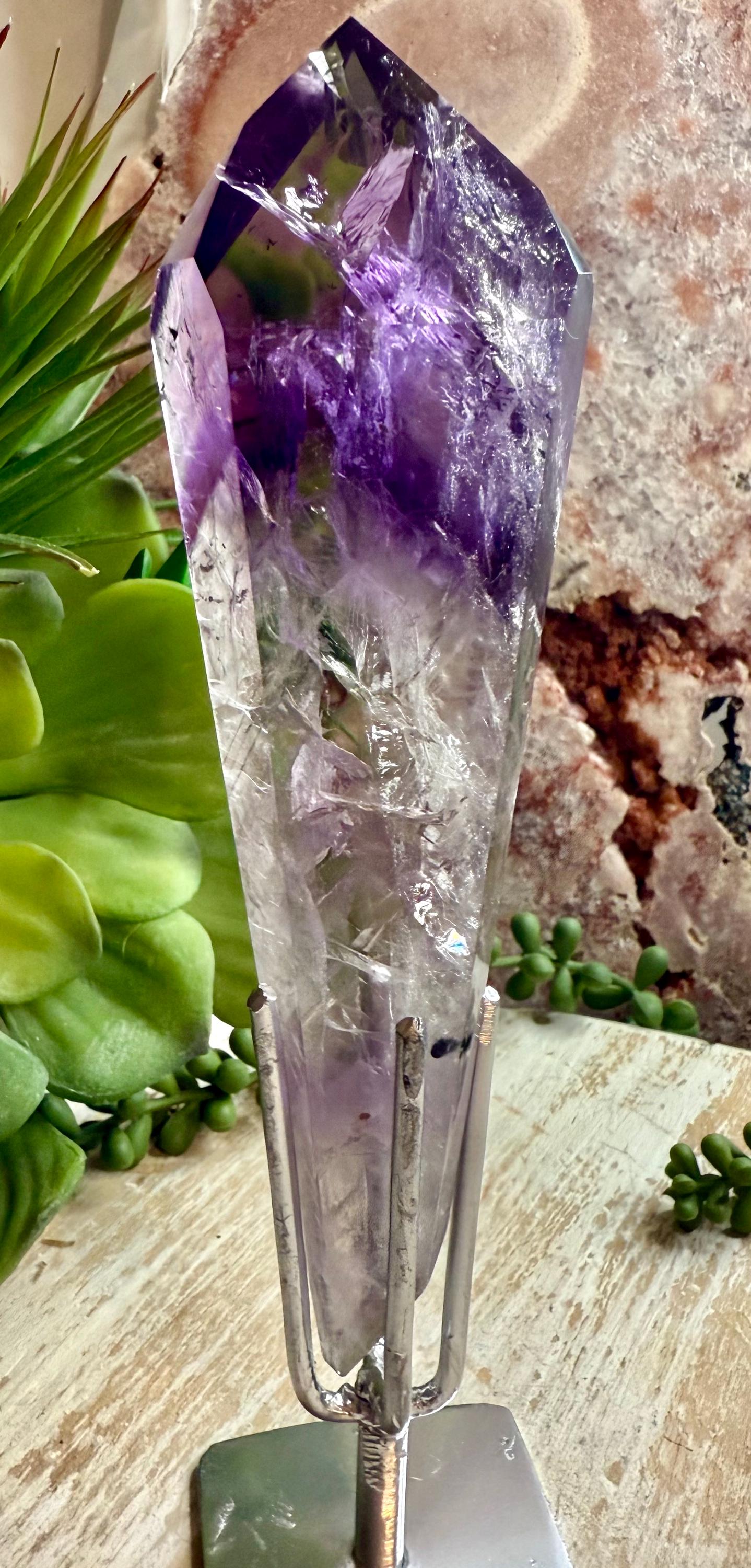 This natural polished amethyst crystal features striking natural color and zoning and is presented on a custom metal stand designed to highlight the specimen's structure and depth.