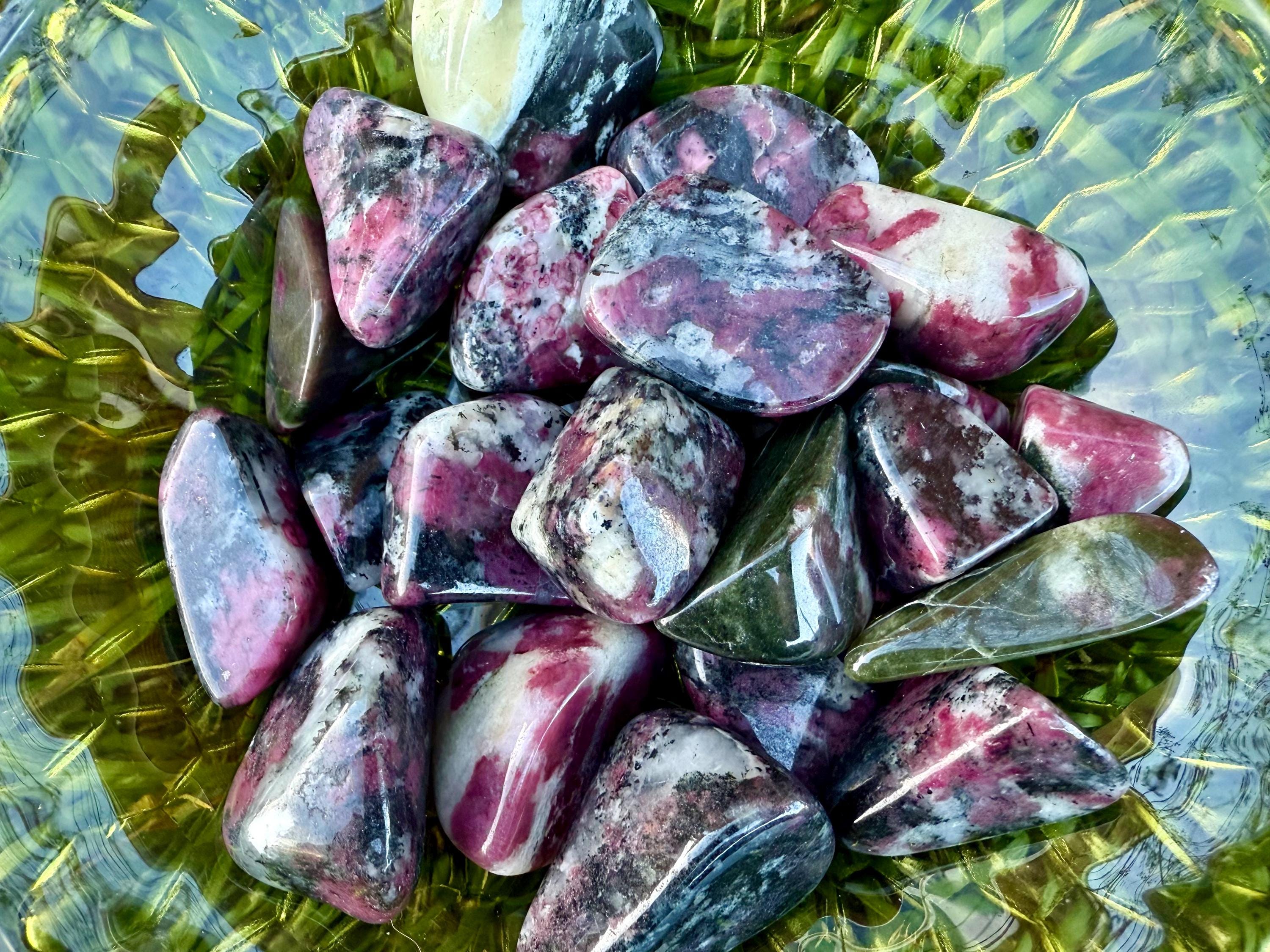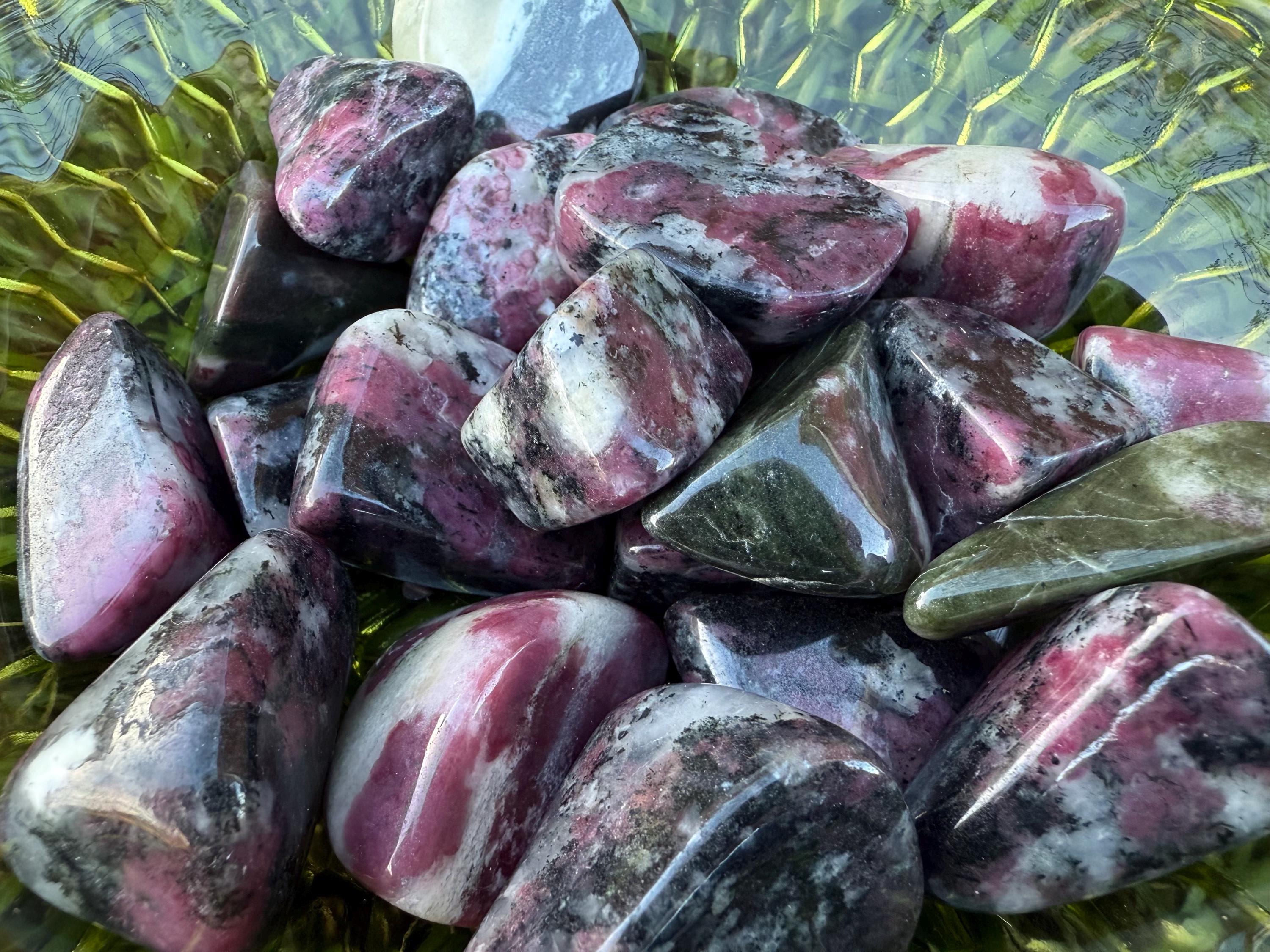 This listing is for one (1) intuitively selected tumbles stone. Polished to a smooth finish while preserving the stone's sticking natural contrast. Eudialyte is known for its pink to red tones with black and gray matrix, making each piece visually unique.