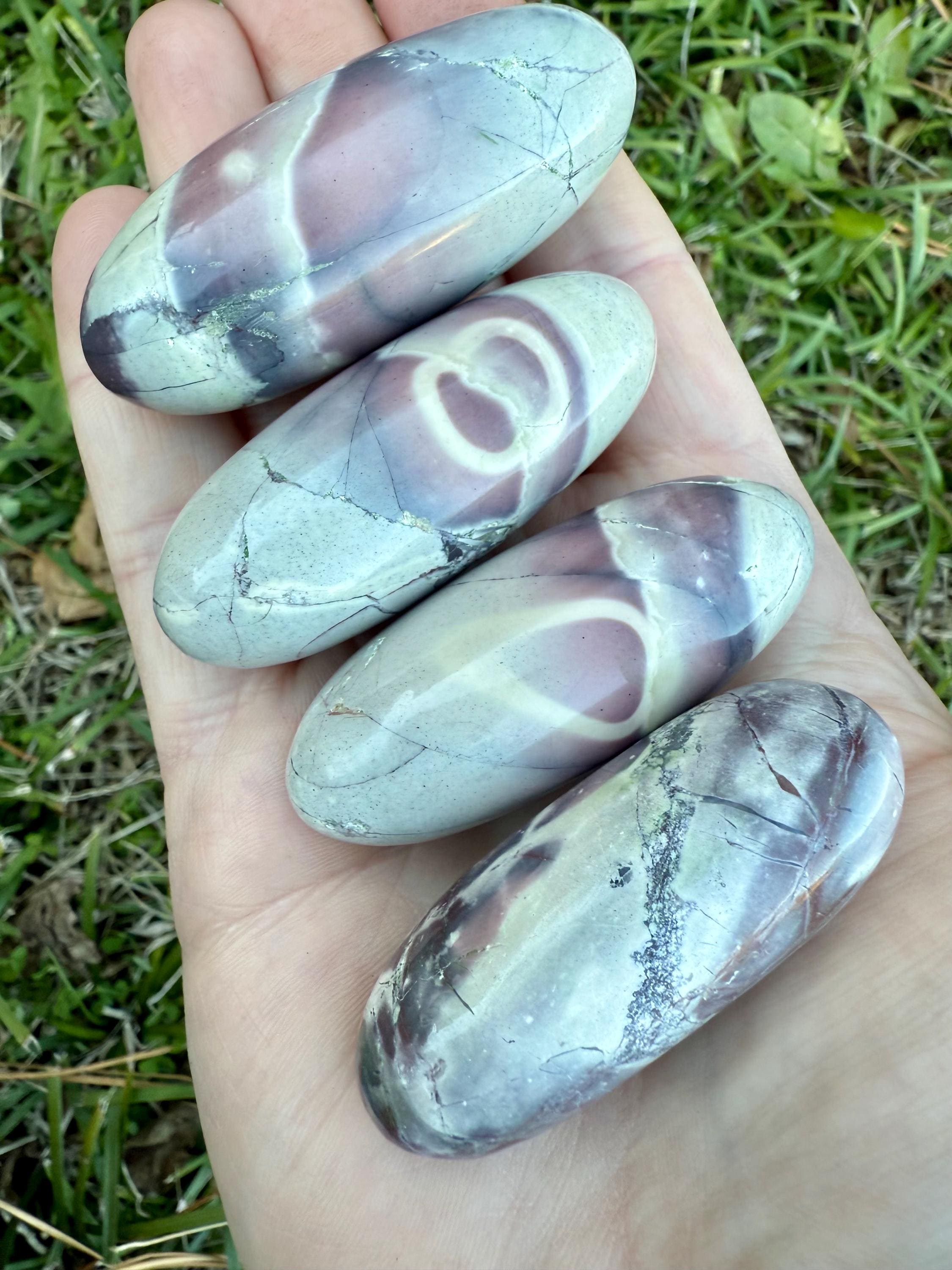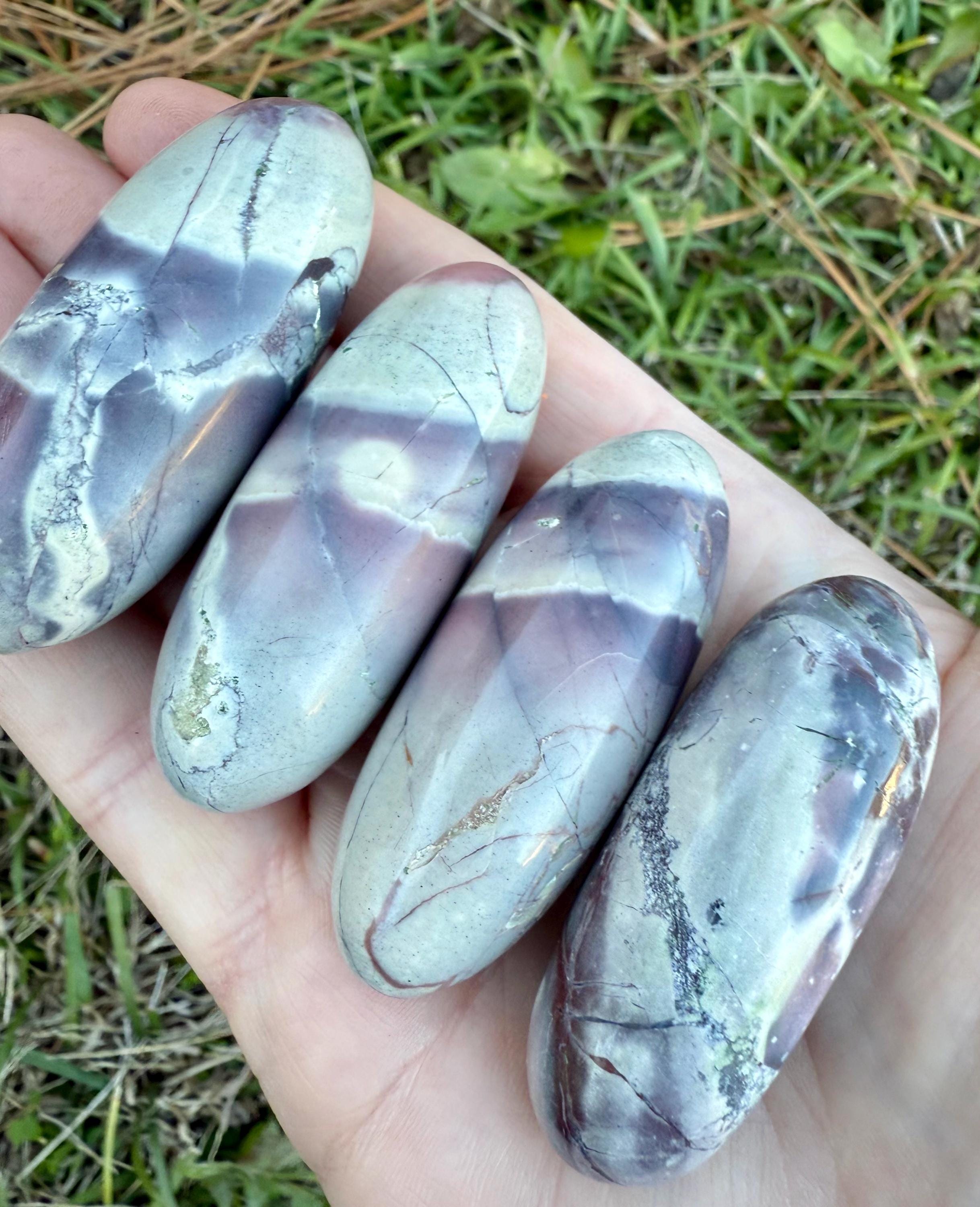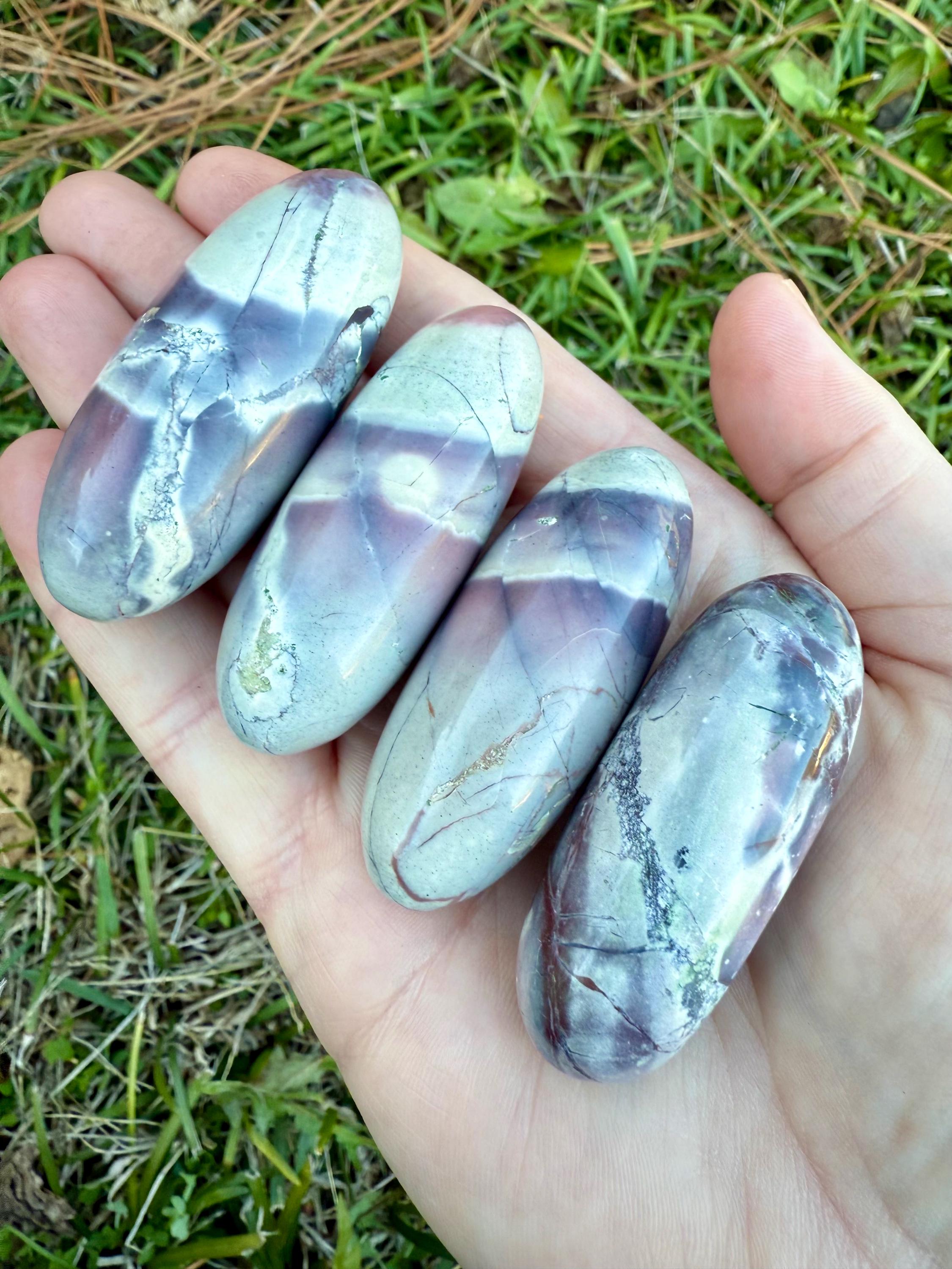 These polished palm stones—also known as Exotica Jasper or Sci-Fi Jasper—are carved from Porcelain Jasper found in the Sierra Madre mountains of Mexico.